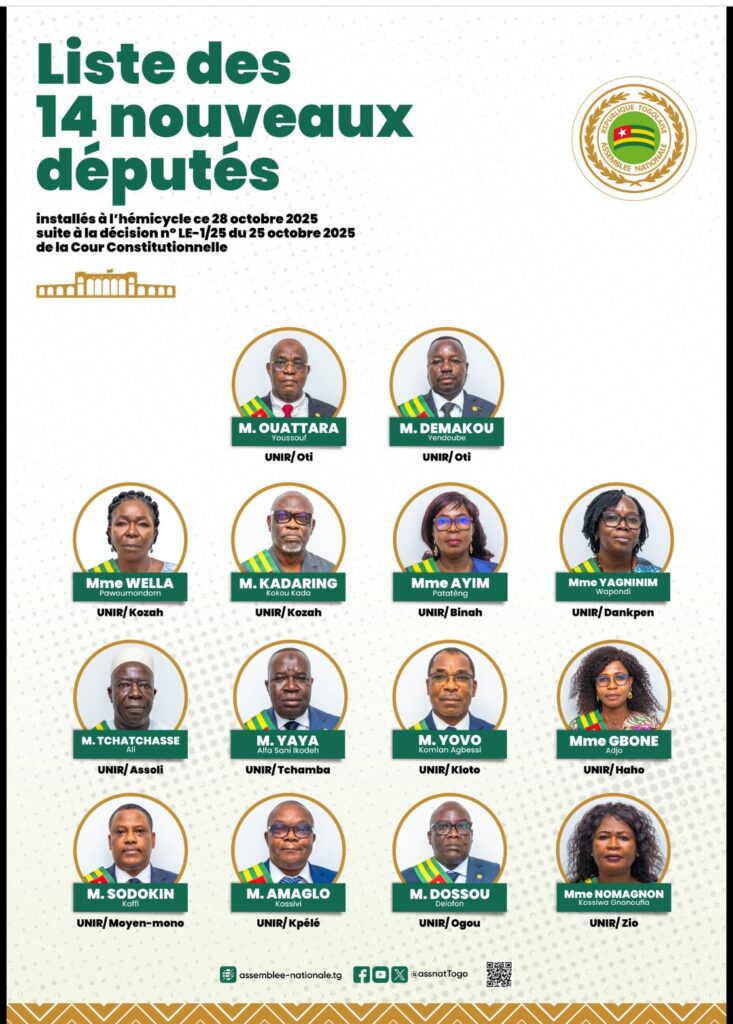 Les quatorze nouveaux députés apportent une perspective régionale élargie à la capitale, puisqu’ils sont issus de douze circonscriptions électorales différentes réparties sur l’ensemble du territoire togolais. Il s’agit d’Oti, Kozah, Binah, Denkpen, Assoli, Tchamba, Kloto, Haho, Moyen-Mono, Kpele, Ogou et Zio. Cette large répartition géographique garantit la représentation des divers intérêts locaux et des voix des différentes communautés dans le processus législatif national.