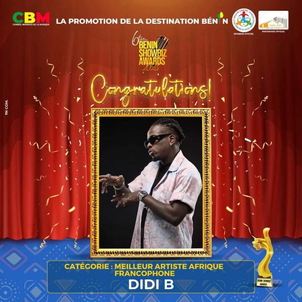 C’est lors de la 6ème édition des Benin Showbiz Awards, que Didi B a remporté le Prix du meilleur artiste francophone. Le rappeur ivoirien a partagé cette excellente nouvelle avec ses nombreux followers sur sa page Facebook il y a quelques jours.
