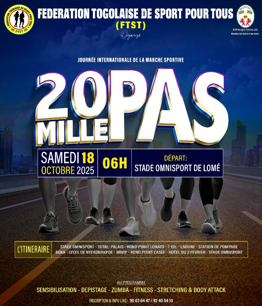 Le samedi 18 octobre à partir de 6h, Lomé se mettra en mouvement avec « 20 Mille PAS », un événement célébrant le sport, le bien-être et la solidarité. Le coup d’envoi se fera au Stade Omnisport de Lomé, pour un itinéraire vivant à travers 11 étapes dans la ville capitale.