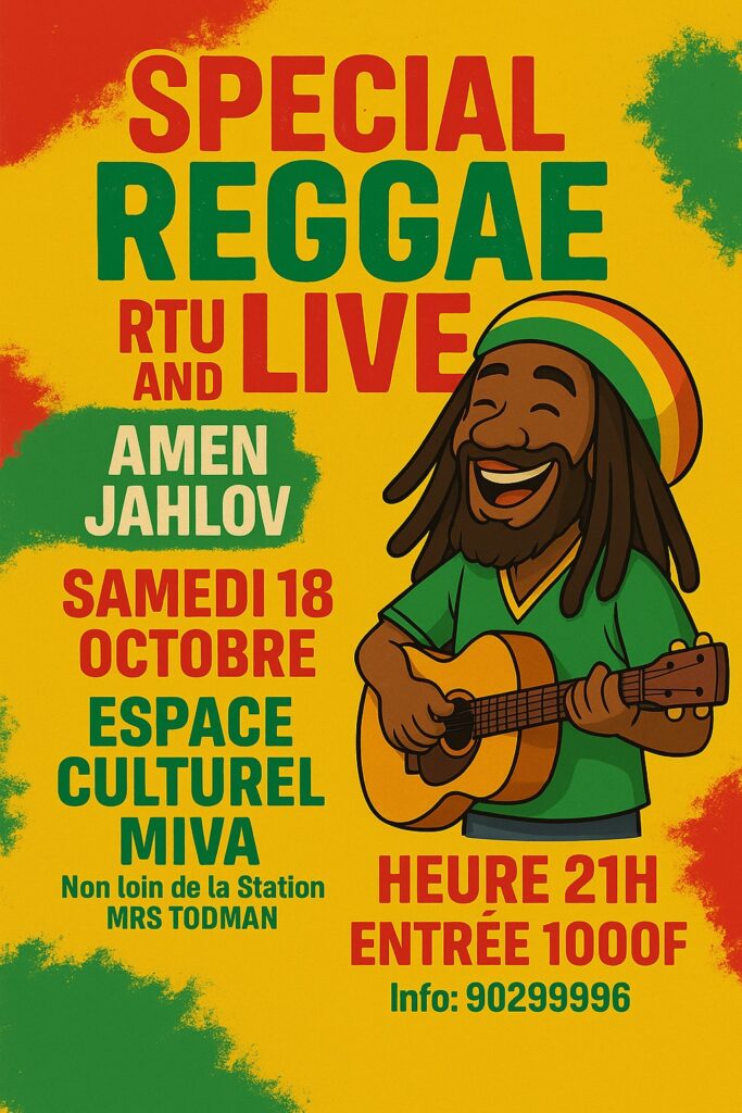 Ce samedi soir, à partir de 21h, direction l’Espace Culturel MIVA pour un concert de reggae live orchestré par Peace Forever Production. Sur scène : RTU et Amen Jahlov, deux figures emblématiques du reggae togolais, vous enflammeront avec leurs mélodies puissantes et engagées.