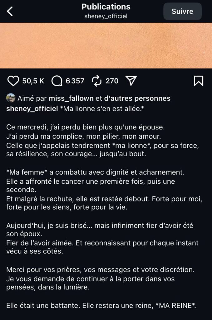 Le chanteur poursuit dans un message empli d’émotion : « Aujourd’hui, je suis brisé… mais fier d’avoir été son époux. Reconnaissant pour chaque instant passé à ses côtés. Merci pour vos prières, vos messages et votre discrétion. Continuez de la garder dans la lumière. Elle était une battante. Elle reste ma reine, MA REINE. »