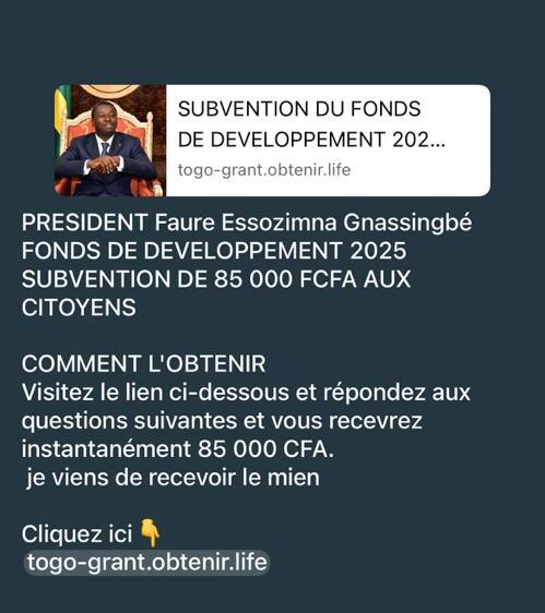 Avertissement à la population togolaise concernant une nouvelle arnaque en ligne. Un message frauduleux circule largement sur les réseaux sociaux et les plateformes de messagerie instantanée, annonçant faussement une subvention de 85 000 FCFA du Président du conseil Faure Gnassingbé. Ce message, qui imite une communication officielle de l’État, constitue une tentative délibérée de tromper et d’escroquer les citoyens.