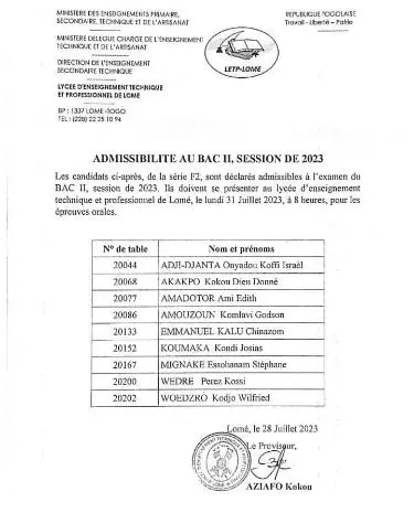 Lomé 31 Juillet 2023 (Lomé Actu) – Quelques jours après la publication officielle des résultats du BAC II 2023 au Togo, une liste additionnelle d’élèves admis a été rendue publique.