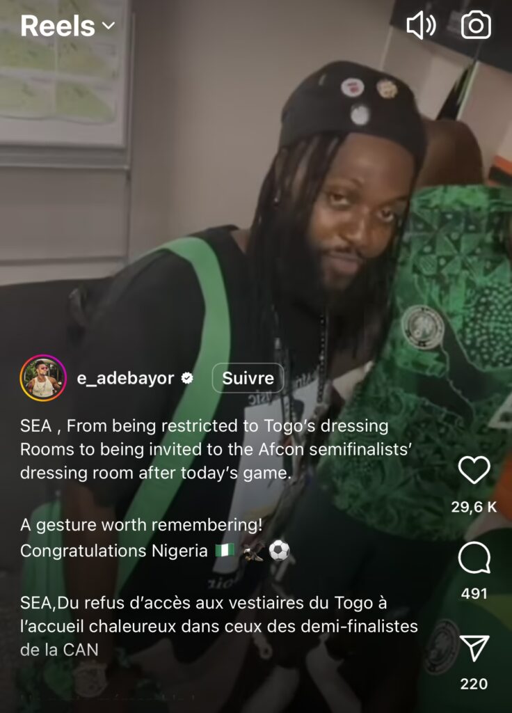 Sur son compte Instagram, Adebayor a posté la vidéo de ce moment avec un petit tacle pour le Togo. A noter que les Nigérians notamment Victor Osimhen accordent une place importante à la légende togolaise depuis le début de cette coupe d’Afrique.