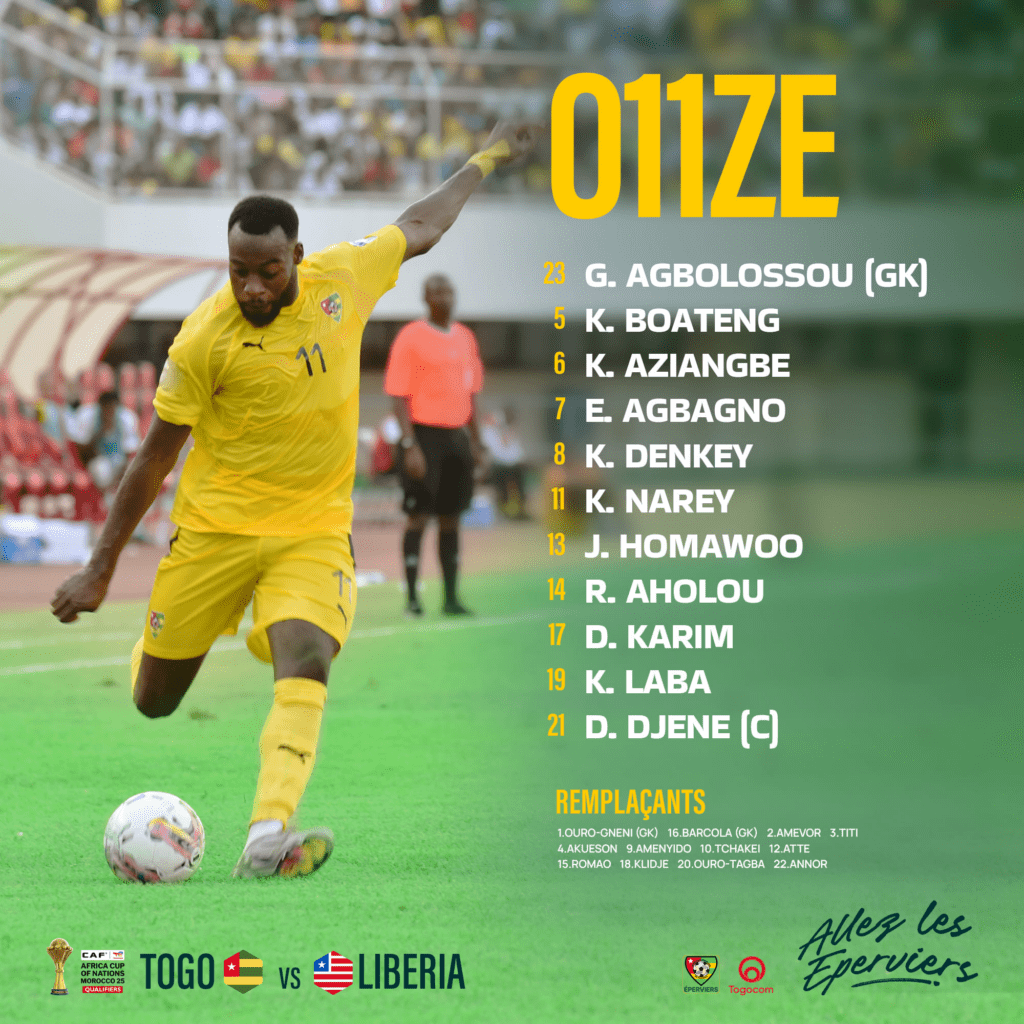 Lomé Actu, 06 septembre 2024, Ce vendredi 6 au stade de Kégué, les Éperviers du Togo affrontent les Lone Stars du Liberia pour le premier tour des éliminatoires de la CAN Maroc 2025. Avec une équipe bien préparée et un public qui attend impatiemment le coup d’envoi à 16h00, le Togo cherche à s’imposer face à un adversaire redoutable. Voici un aperçu du 11 entrant des Éperviers et leur dynamique avant le match.