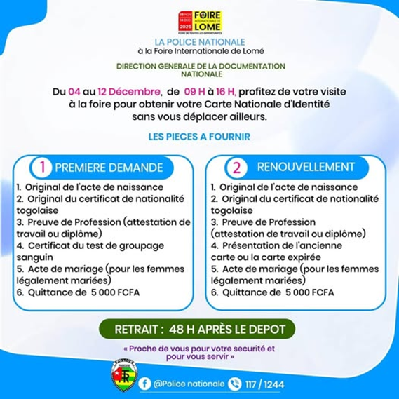 Une opportunité pratique et rapide s’offre aux citoyens dans le cadre de la 20ème Foire Internationale de Lomé pour obtenir plus facilement leur carte nationale d’identité. Du jeudi 4 au vendredi 12 décembre 2025, la Police Nationale, via la Direction Générale de la Documentation Nationale (DGDN), installe un service mobile directement sur le site du CETEF.
