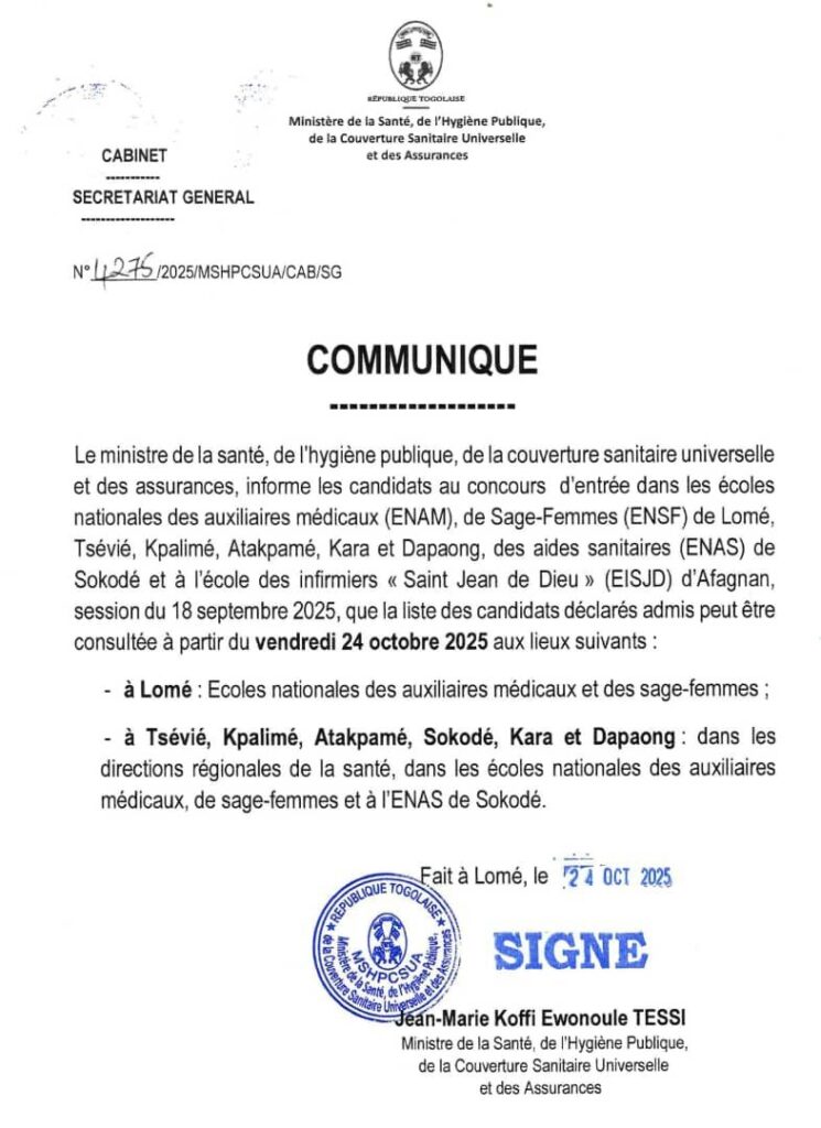 L’avenir du système de santé togolais a franchi une étape avec la publication des résultats très attendus des concours d’entrée dans les écoles de santé. Le vendredi 24 octobre, le ministère de la Santé a officiellement publié les listes des admis de plusieurs établissements de formation sanitaire clés.