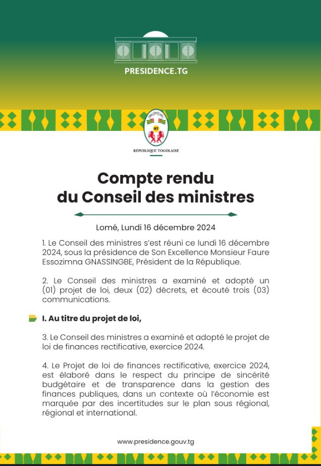 Compte rendu complet du conseil des ministres de ce 16 décembre 2024