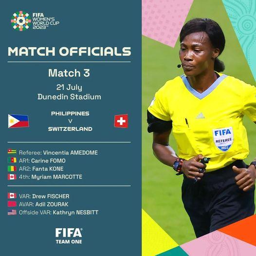 Amédomé Vincentia officiera le match entre les Philippines et la Suisse. Elle sera assistée par un quatuor d’arbitres composé de Carine Fomo du Cameroun, Fanta Kone et Myriam Marcotte du Canada.