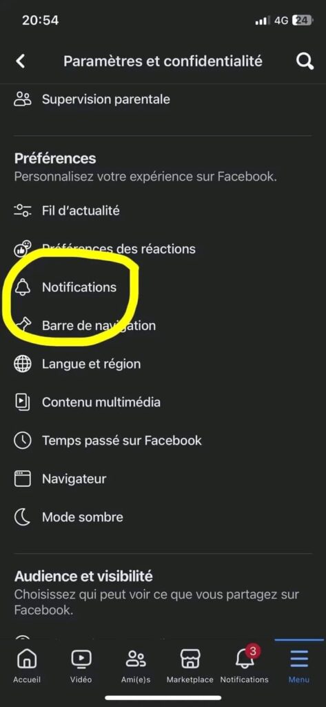 - Paramètres de notification : Dans le menu des réglages, localisez et cliquez sur l’option « Notifications ». Vous accéderez ainsi à une page où vous pourrez personnaliser vos préférences en matière de notifications.