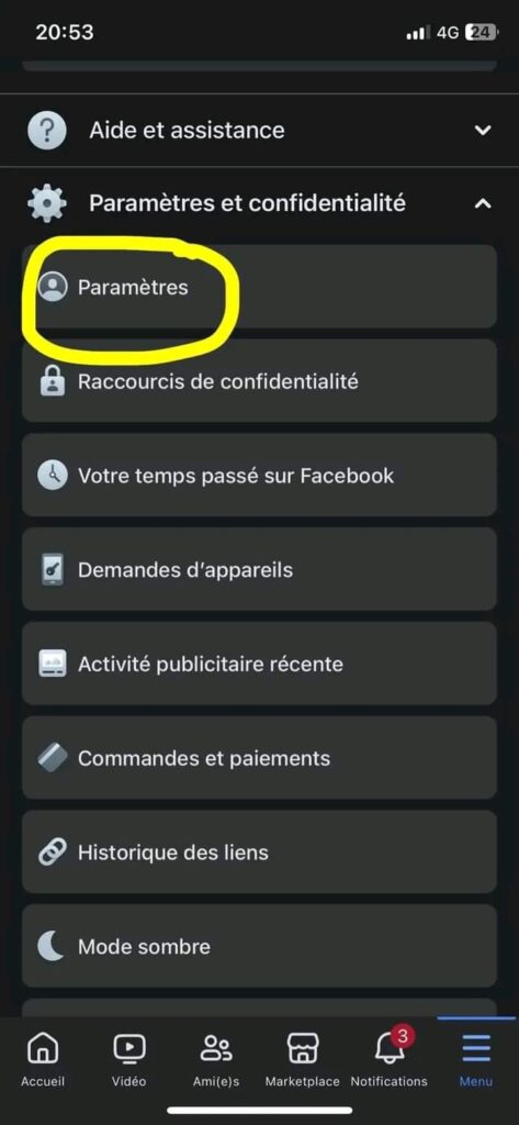 - Réglages d’accès : Commencez par vous rendre dans vos paramètres Facebook. Vous pouvez y accéder en cliquant sur l’icône de menu située dans le coin supérieur droit de votre page d’accueil Facebook.