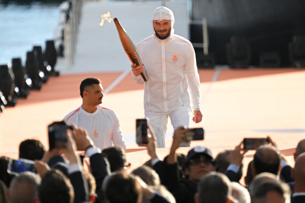 Peu de temps après, Florent Manadou, le premier relayeur français, présente la flamme olympique à la foule, tandis que l’Orchestre Philharmonique de Marseille fait retentir l’hymne des Jeux olympiques.