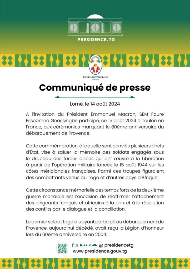 Lomé Actu, 14 août 2024 – Le président du Togo Faure Essozimna Gnassingbé se joindra aux dirigeants mondiaux à Toulon, en France, le 15 août 2024. Ce rassemblement de haut niveau marque le 80e anniversaire du débarquement de Provence.