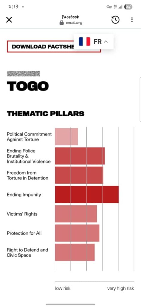 Guy Valère Badanaro, coordinateur régional du programme Afrique du CACIT, a averti qu’aucun pays évalué n’est totalement à l’abri des risques de torture. « Cependant, cela ne signifie pas que le Togo est épargné par le phénomène. Tous les pays évalués présentent un risque d’exposition à la torture. Aucun n’est totalement exempt », a-t-il noté.