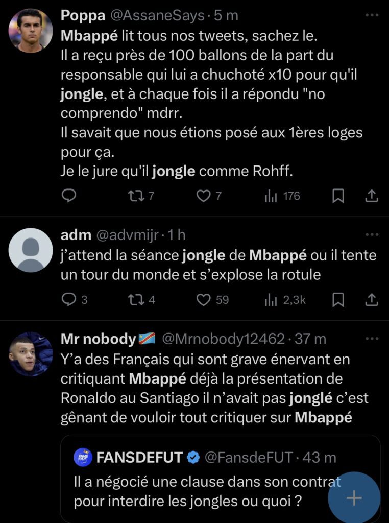 Un moment qui ne cesse d’irriter les fans du club Merengue. Pour plusieurs personnes Mbappé ne sait pas jongler. Pour certains il a mis une clause dans son contrat qui interdit les jongles.