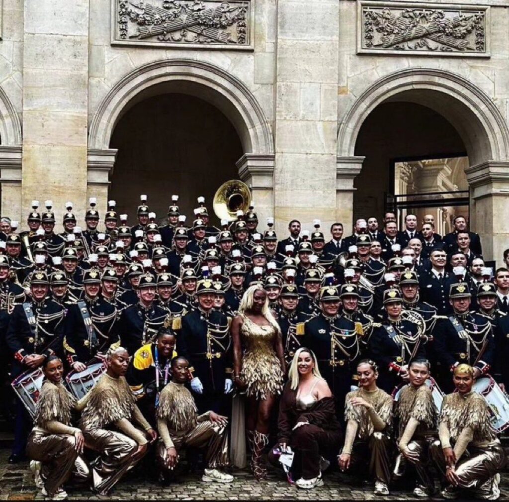Toute d’or vêtue, elle a commencé à chanter son tube « Pookie », avant de rejoindre la Garde républicaine et d’entonner avec eux l’air de Charles Aznavour.