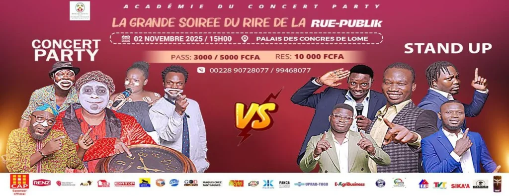 Préparez-vous à une nuit de fous rires ce dimanche 02 Novembre 2025 à 19h au Palais des Congrès de Lomé ! La Rue-Publik débarque en force avec un show unique : une battle entre stand-up et concert party, réunissant les plus grands humoristes du Togo.