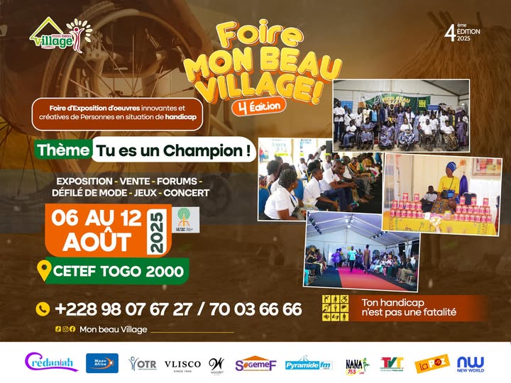 Tu es un Champion !” Tel est le thème fort de la 4e édition de la Foire Mon Beau Village, qui met à l’honneur les personnes en situation de handicap. Une semaine intense d’émotions, de partages et d’innovations vous attend au CETEF TOGO 2000, avec un programme riche : expositions, ventes, défilés, concerts, animations culturelles et rencontres professionnelles du 06 au 12 Août 2025.