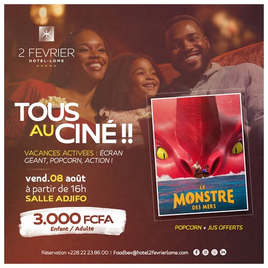 Tarif unique : 3.000 FCFA (enfants & adultes) ; Popcorn + jus offerts à chaque spectateur.