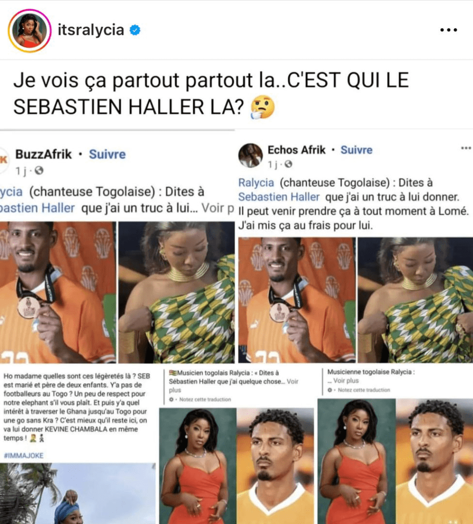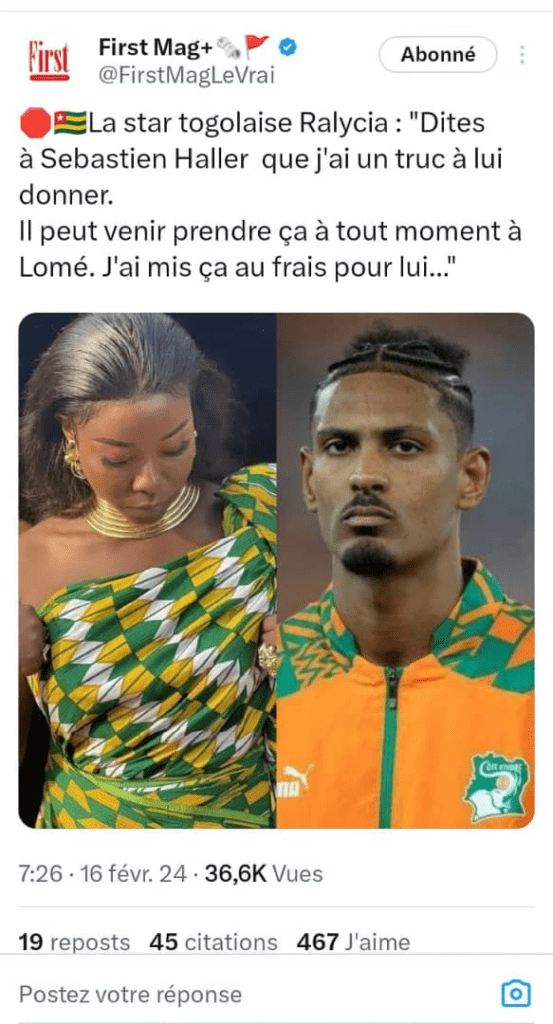 « La star togolaise Ralycia : Dites à Sebastien Haller que j’ai un truc à lui donner. Il peut venir prendre ça à tout moment à Lomé. J’ai mis ça au frais pour lui… » rapporte le média First Mag+ .