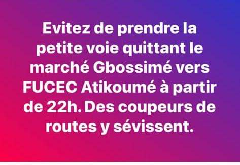 Sur Facebook, un internaute a d’ailleurs lancé un avertissement à l’endroit des usagers de cette ruelle la nuit : « Évitez de prendre la petite voie quittant le marché Gbossimé vers FUCEC Attikoumé à partir de 22h. Des coupeurs de routes y sévissent. »