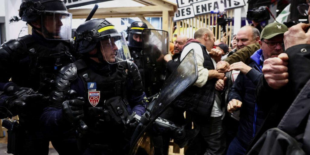 Des dizaines d’agriculteurs font toujours face aux gendarmes mobiles et aux policiers des compagnies républicaines de sécurité dans une allée du Salon de l’agriculture, à quelques dizaines de mètres de la pièce où Emmanuel Macron est en train d’échanger avec les représentants syndicaux des agriculteurs.
