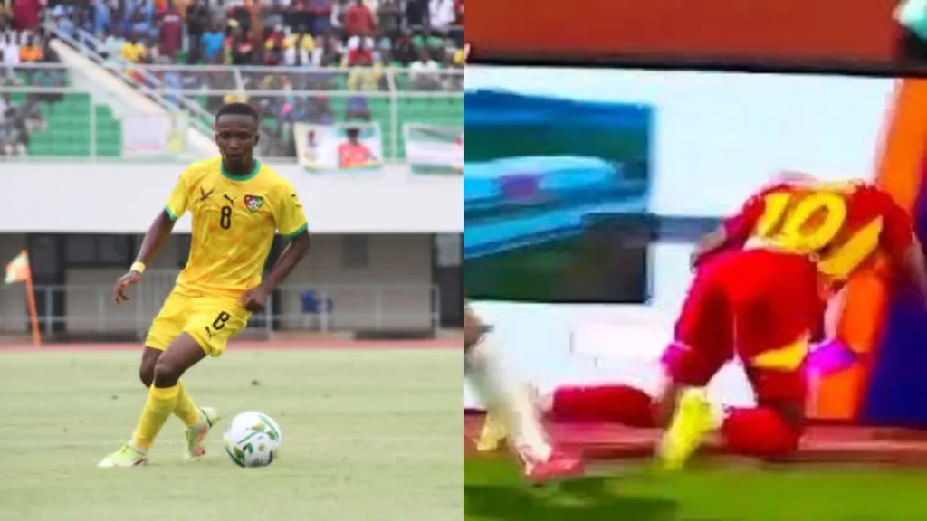 La force de la poussée a propulsé le footballeur togolais en avant, complètement déséquilibré. Il a percuté la tête la première un panneau publicitaire solide à quelques mètres de la ligne de but, incapable d’amortir efficacement sa chute malgré une tentative désespérée d’amortir l’impact avec ses mains.