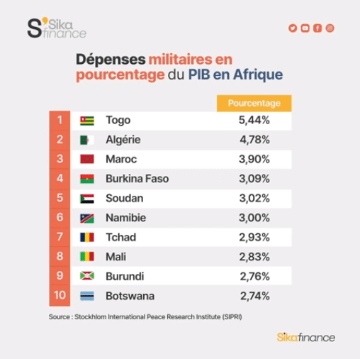 Outre le Togo, le Maroc et l’Algérie, d’autres pays font énormément d’efforts en matière de dépenses militaires par rapport au PIB national :