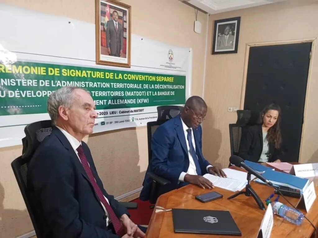 La convention, signée par le ministre Hodabalo Awaté et l’ambassadeur Claudius Fischbach, prévoit une enveloppe financière de 20 millions d’euros, soit environ 13 milliards FCFA. Cette initiative vise à soutenir 69 communes sélectionnées dans les régions pilotes de Plateaux, Centrale et Kara au cours des 3 à 4 prochaines années.