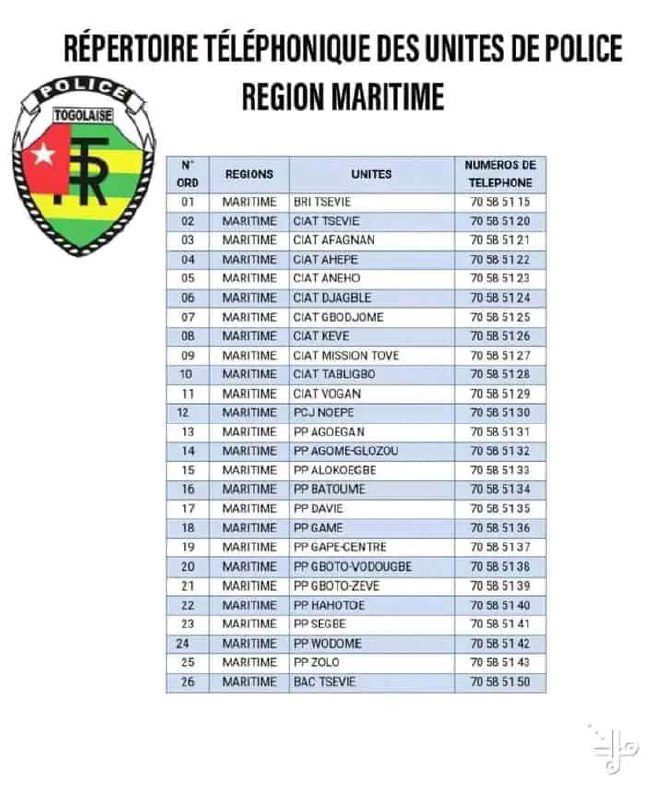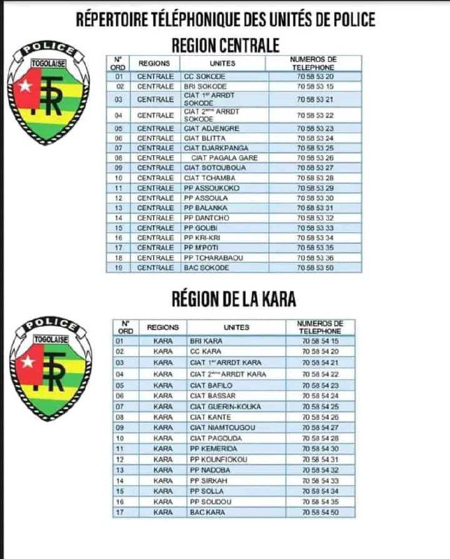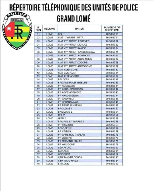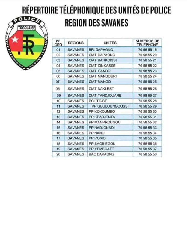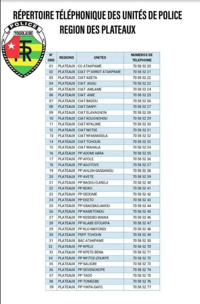 Afin de permettre une intervention plus rapide en cas d’urgence, la Police Nationale togolaise lance un répertoire téléphonique des Unités de police sur tout le territoire togolais. La population peut désormais contacter directement les unités de police en cas d’alerte ou de situation suspecte.
