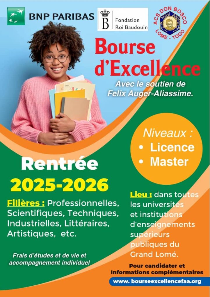 L’Association des Coopérateurs Salésiens de Don Bosco-Togo, en partenariat avec la Fondation Roi Baudouin et avec le soutien financier de BNP Paribas et du champion de tennis Félix Auger-Aliassime, annonce le lancement d’une bourse d’excellence pour l’année universitaire 2025-2026. Ce programme ambitieux vise à soutenir les étudiants talentueux dans leur parcours académique.