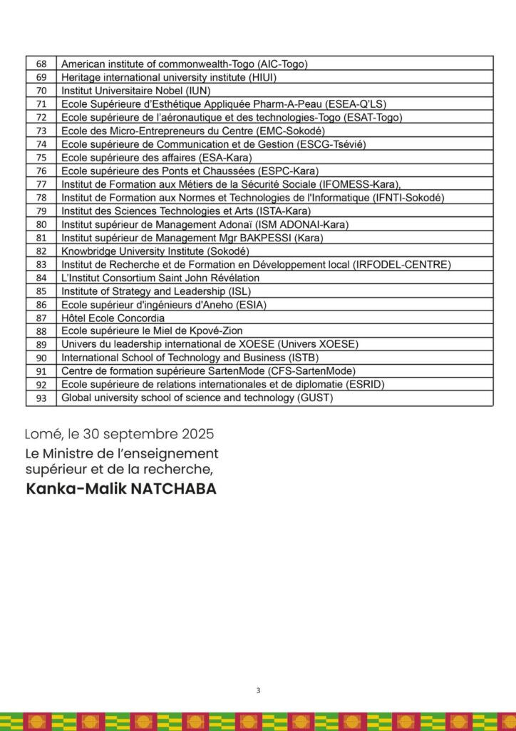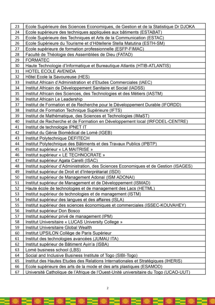 La liste comprend un large éventail d’établissements accrédités répartis dans plusieurs villes. Parmi les établissements notables figurent l’Institut africain d’administration et d’études commerciales (IAEC), l’École supérieure des affaires (ESA) et l’École supérieure de gestion et d’informatique (ESGIS). L’Université catholique de l’Afrique de l’Ouest (UCAO-UUT) figure également sur la liste, ainsi que plusieurs établissements nouvellement accrédités dans des villes comme Kara, Sokodé et Aného.