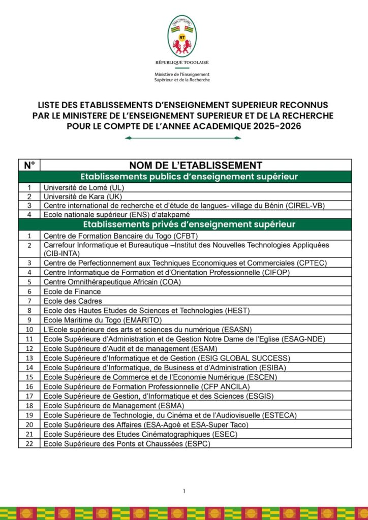 Le ministère de l’Enseignement supérieur et de la Recherche a publié la liste officielle des universités accréditées au Togo. Il s’agit d’établissements autorisés à exercer au Togo pour l’année universitaire 2025.
