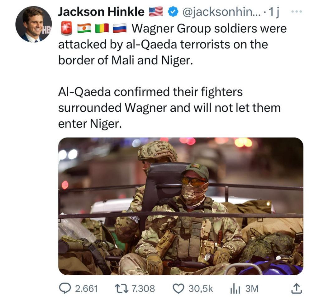 Selon les dernières informations publiées sur le réseau social X (anciennement Twitter) le youtubeur américain et streamer politique, Jackson Hinkle a donné une alerte. Selon sa publication, des soldats du groupe Wagner ont été attaqués par des terroristes d’Al-Qaïda à la frontière du Mali et du Niger.