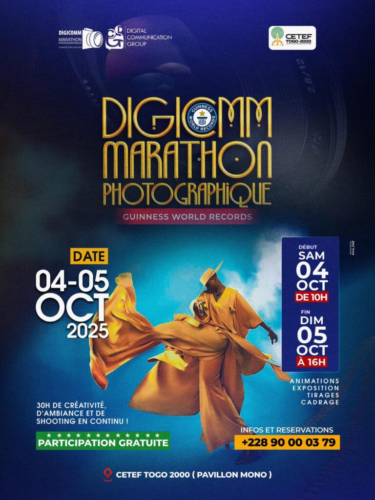 Prêts pour un défi hors du commun ? Le DIGICOMM Marathon Photographique propose 30 heures non-stop de shooting, d’animations, d’expositions et d’ambiance. L’objectif est ambitieux : inscrire Lomé dans le Guinness World Records grâce à la créativité des photographes et à la richesse du patrimoine culturel togolais. Du samedi 4 octobre (10h) au dimanche 5 octobre (16h) au CETEF – Togo 2000, Pavillon Mono, venez profitez d’un shooting gratuit tout en soutenant les participants.