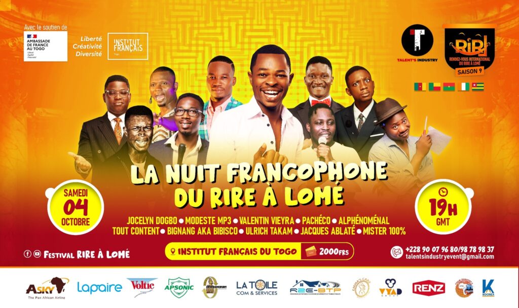 La neuvième saison du Festival Rire à Lomé bat son plein. Et ce weekend, place au moment fort : La Nuit Francophone du Rire ! Sur scène : Jocelyn Dogbo, Pacheco, Alphénoménal, Ulrich Takam, Tout content, et bien d’autres humoristes venus de plusieurs horizons. Une soirée explosive garantie 100 % fou rire à 2000 F CFA à l’Institut Français du Togo ce samedi 04 Octobre 2025.