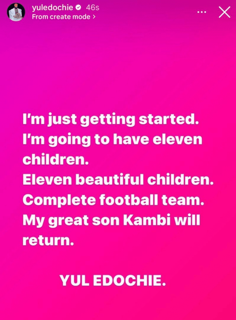 Il a proclamé qu’il aurait un total de onze enfants au cours de sa vie. L’acteur l’a fait savoir sur sa page Instagram aujourd’hui 24 avril, ajoutant que son fils décédé, Kambi, »reviendra ».